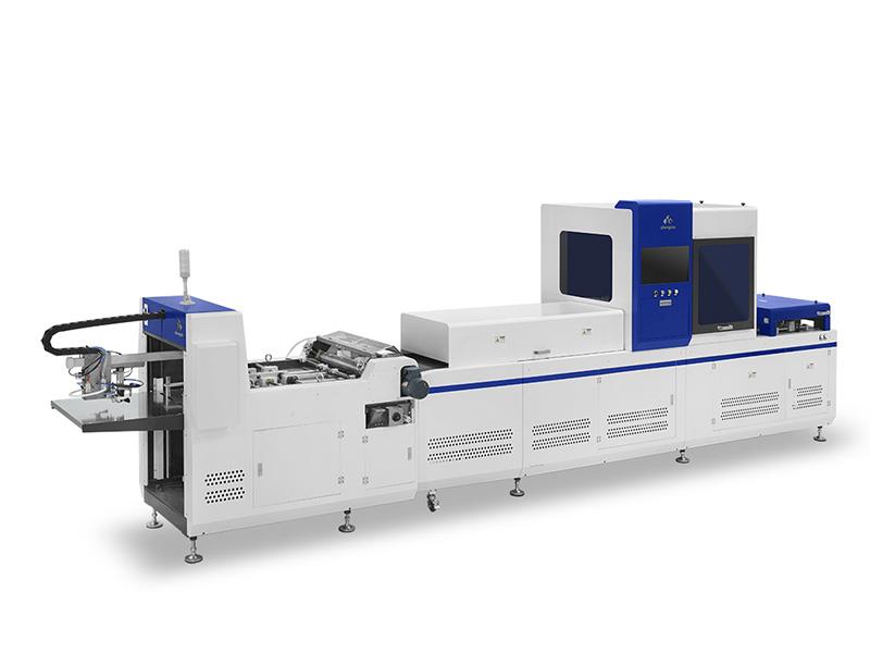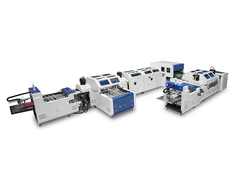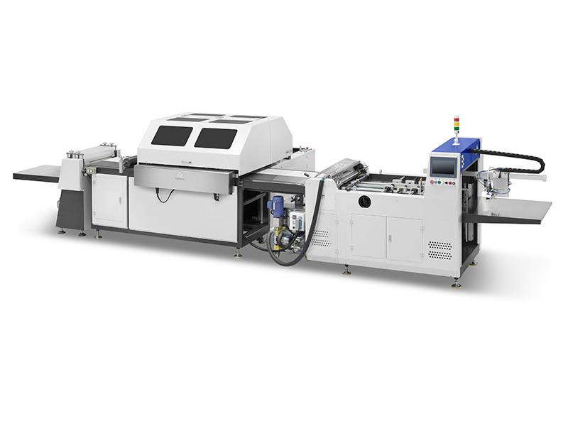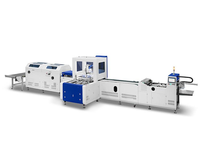 飞达送面纸、上胶,飞达送纸板,面纸与纸板定位粘合,四边包边一次完成。具有定位准确、快速,成品美观等特点。可以用来制作精装书壳、笔记本封面、台历、挂历、书形盒、文件夹、异形封面等。